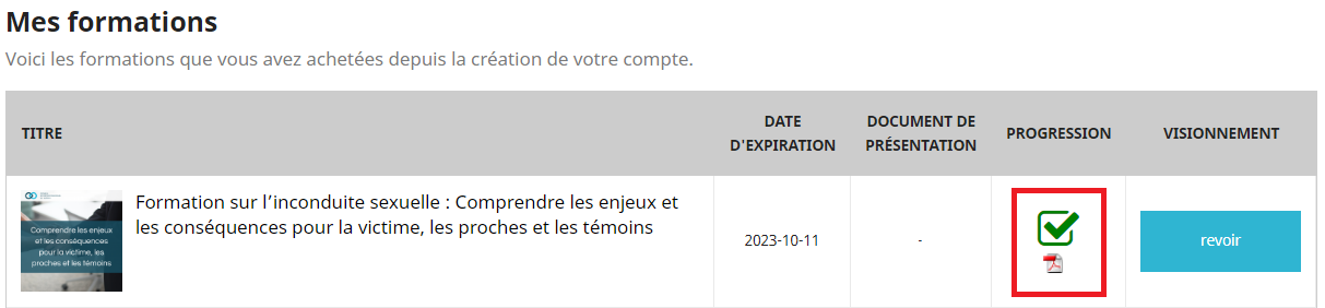 Lorsque vous complétez une formation, vous avez accès sur votre tableau de bord à votre attestation que vous pouvez télécharger en format PDF. Il vous suffit de vous rendre sur la page Mes formations, accessible à partir de votre tableau de bord. Vous y trouverez la liste de vos formations et leur statut de progression. Pour toutes les formations que vous aurez visionnées en entier, vous verrez une icône de document PDF apparaître dans la colonne Progression. Il suffit de cliquer sur cette icône pour télécharger votre attestation.