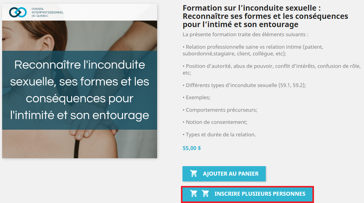 Il vous est possible d’acheter une formation pour une autre personne. Pour ce faire, sélectionnez dans le catalogue la formation que vous désirez acheter. Vous serez redirigé vers la fiche de la formation qui contient une description de celle-ci. En défilant la page vers le bas, vous trouverez deux boutons. Lorsque vous cliquerez sur le second bouton « Inscrire plusieurs personnes », un fichier Excel sera téléchargé. Vous y trouverez les instructions à suivre pour remplir le fichier d’inscription en lot et nous le retourner afin que nous puissions inscrire la ou les personnes de votre choix à la formation choisie.