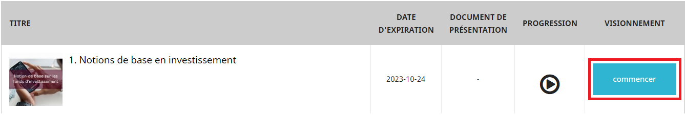 Une fois la liste de vos formations affichée, choisissez celle que vous désirez visionner et cliquez sur le bouton « Commencer ».