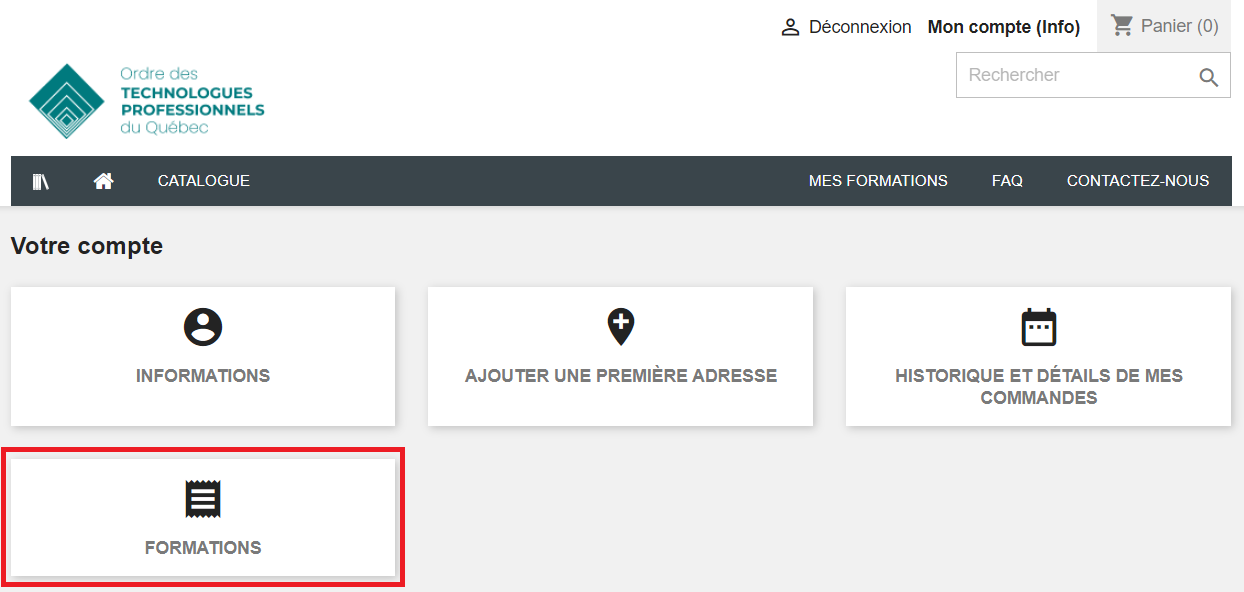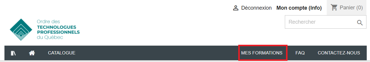 Une fois connectés à votre compte, vous devez vous rendre dans la section Mes formations, aussi accessible à partir de la barre de menu de navigation ou de votre tableau de bord.